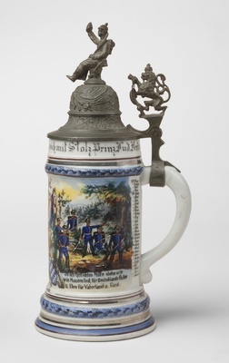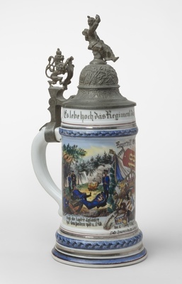 Auf der Spitze des Reservistenkruges sitzt eine Soldatenfigur. Als Hahn dient ein Wappenlöwe, welcher ein Schild mit den Pfoten trägt. Am oberen Rand des Kruges sind der Schriftzug: "Es lebe hoch das Regiment daß sich mit Stolz Prinz Lud. Ferd. nennt" zu lesen. Darunter ist der Eichstrich für 0.5 Liter angebracht. Die zwei dargestellten Szenen werden durch ein Schild mit der Nummer "18", einer Krone über einem Wappen und zwei Löwen rechts und links des Wappens voneinander getrennt. Darüber ist "Reservist Gimbel. 1899 1901" zu lesen, darunter "Erinnerung an Dienstzeit bei d. 3. Comp 18.Bayr.Inft.Regt. Erste Reserve ds 20. Jahrh. in Landau.". Die linke Szene zeigt sechs Soldaten mit zwei Zelten an einem Lagerfeuer im Wald. Als Bildunterschrift ist zu lesen: " Hoch die tapfre Infantre Auf dem Posten spät u. früh." Im linken Bildmotiv sind sieben bewaffnete Soldaten in einem Wald dargestellt. Als Bildunterschrift ist zu lesen: "In des Gefeches Mitte stehn wir wie Mauern fest, für Deutschlands Ruhm u. Ehre für Vaterland u. Fürst." Eingerahmt ist das Motiv an der Ober- und Unterseite durch ein blaue Bordüre mit Eichenblättern und drei Silberbordüren. Am rechten und linken Bildrand sind die Angehörigen des Regiments aufgelistet. Links: Res. Hans, Henkel, Hilsendegen, Hufnagel, Jung, Jacob, Kalte, Kieborz, Köhler, Luckart, Letsch, Leibig, Link, Michel, Morlo, Poh, Rapuet, Schmitt, Simon, Schäfer, Theobald, Wendel, Waldmann, Wagner, Walter und Zott. Rechts: Utff. Henger, Dornick, Diehl und Kraus; Gftr. Bäcken, Blaul, Dehn, Forcht, Franz, Freund, Geitlinger, Haag, Koch, Kunz, Oeffler, Schwinn und Vettermann; Tbr. Breitwieser und Kappes; Horn. Blauth und Schmitt und die Res. Adrian, Bauer, Beckmann, Eislöffel, Feil, Gimbel, Giessen und Schmitt F. Der Zinndeckel ist mit einem floralen Muster und diversen militärischen Gegenständen, u.a. Fahnen und Waffen, verziert. Auf der Spitze sitzt eine Soldatenfigur. Als Hahn dient ein Wappenlöwe mit einem Schild an den Pfoten. Den Gefäßboden ziert eine Lithophanie, welche drei Personen zeigt, die sich in einem Raum zu befinden scheinen.