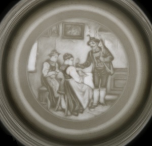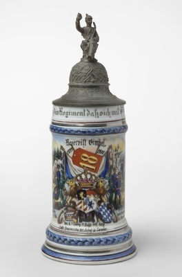 Auf der Spitze des Reservistenkruges sitzt eine Soldatenfigur. Als Hahn dient ein Wappenlöwe, welcher ein Schild mit den Pfoten trägt. Am oberen Rand des Kruges sind der Schriftzug: "Es lebe hoch das Regiment daß sich mit Stolz Prinz Lud. Ferd. nennt" zu lesen. Darunter ist der Eichstrich für 0.5 Liter angebracht. Die zwei dargestellten Szenen werden durch ein Schild mit der Nummer "18", einer Krone über einem Wappen und zwei Löwen rechts und links des Wappens voneinander getrennt. Darüber ist "Reservist Gimbel. 1899 1901" zu lesen, darunter "Erinnerung an Dienstzeit bei d. 3. Comp 18.Bayr.Inft.Regt. Erste Reserve ds 20. Jahrh. in Landau.". Die linke Szene zeigt sechs Soldaten mit zwei Zelten an einem Lagerfeuer im Wald. Als Bildunterschrift ist zu lesen: " Hoch die tapfre Infantre Auf dem Posten spät u. früh." Im linken Bildmotiv sind sieben bewaffnete Soldaten in einem Wald dargestellt. Als Bildunterschrift ist zu lesen: "In des Gefeches Mitte stehn wir wie Mauern fest, für Deutschlands Ruhm u. Ehre für Vaterland u. Fürst." Eingerahmt ist das Motiv an der Ober- und Unterseite durch ein blaue Bordüre mit Eichenblättern und drei Silberbordüren. Am rechten und linken Bildrand sind die Angehörigen des Regiments aufgelistet. Links: Res. Hans, Henkel, Hilsendegen, Hufnagel, Jung, Jacob, Kalte, Kieborz, Köhler, Luckart, Letsch, Leibig, Link, Michel, Morlo, Poh, Rapuet, Schmitt, Simon, Schäfer, Theobald, Wendel, Waldmann, Wagner, Walter und Zott. Rechts: Utff. Henger, Dornick, Diehl und Kraus; Gftr. Bäcken, Blaul, Dehn, Forcht, Franz, Freund, Geitlinger, Haag, Koch, Kunz, Oeffler, Schwinn und Vettermann; Tbr. Breitwieser und Kappes; Horn. Blauth und Schmitt und die Res. Adrian, Bauer, Beckmann, Eislöffel, Feil, Gimbel, Giessen und Schmitt F. Der Zinndeckel ist mit einem floralen Muster und diversen militärischen Gegenständen, u.a. Fahnen und Waffen, verziert. Auf der Spitze sitzt eine Soldatenfigur. Als Hahn dient ein Wappenlöwe mit einem Schild an den Pfoten. Den Gefäßboden ziert eine Lithophanie, welche drei Personen zeigt, die sich in einem Raum zu befinden scheinen.