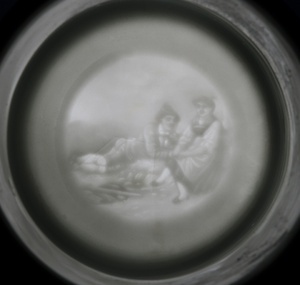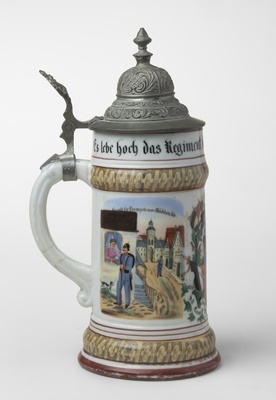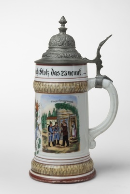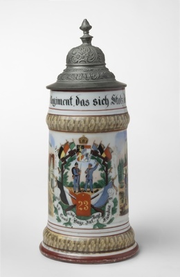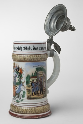 Reservistenkrug für das "23. Bayer. Infanterie Regiment". Am oberen Rand sind der Schriftzug: "Es lebe hoch das Regiment, das sich Stolz das 23. nennt" und der Eichstrich für 1/2 Liter zu lesen. Darunter sind drei Bildmotive zu sehen. Das rechte zeigt im Hintergrund eine Straße in einer Ortschaft. Im Vordergrund erkennt man eine Frau, welche von einem Fenster nach draußen blickt, davor steht ein Mann. Als Bildüberschrift ist "Es ruft die Trompete nun Mädchen Ade.", zu lesen In der Mitte des Motivs stehen zwei Soldaten umringt von diversen Fahnen und Planzen, sowie einem Wappen mit darüberstehender Krone. Darunter sind ein Schild mit der Nummer 23, zwei Gewehre und ein Banner mit der Aufschrift: "1898. b.d. Comp. 23. Kgl. Bayr. Inf. Regt. Landau. 1900.", angebracht. Der linke Bildteil zeigt eine Personengruppe, bestehend aus zwei Soldaten, einem Mann und einer Frau, welche vor einem Haus stehen. Die Bildüberschrift lautet: "Einquartierung kommt". An der Ober- und Unterseite wird das gesamte Bildmotiv mit zwei ornamentalen Bordüren eingerahmt. Der Zinndeckel ist mit ornamentaler und floraler Verzierung versehen. Als Hahn dient ein florales Muster. Auf dem Gefäßboden ist eine Lithophanie, welche zwei Personen auf einer Wiese zeigt, zu sehen.