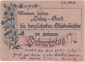 Feldpostkarte mit Geburtstagsgruß vom Kriegsgefangenen Heinrich-Karl Reuber an seinen Sohn aus dem U.d.S.S.R. Kriegsgefangenenlager Nr. 7271/I vom 4.9.1949. Der Vordruck der Karte ist zweisprachig in russisch und französisch. Rückseitig ist eine kalligrafische Zeichnung mit den Geburtstagswünschen vorhanden.