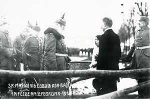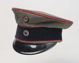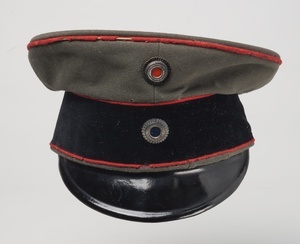 Feldgraue Schirmmütze M 1915, Offiziersmütze zur feldgrauen Friedensuniform in Bayern; schwarzer Schirm aus Vulkanfiber, schwarzer Besatzstreifen aus Samt mit ponceaurotem Vorstoß; Kokarden: deutsche Kokarde (Offizierskokarde) in schwarz-weiß-rot; Landeskokarde Bayern in weiß-blau auf Besatzstreifen.