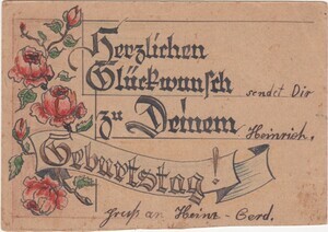 Feldpostkarte mit Geburtstagsgruß vom Kriegsgefangenen Heinrich-Karl Reuber an seinen Sohn aus dem U.d.S.S.R. Kriegsgefangenenlager Nr. 7271/I vom 4.9.1949. Der Vordruck der Karte ist zweisprachig in russisch und französisch. Rückseitig ist eine kalligrafische Zeichnung mit den Geburtstagswünschen vorhanden.