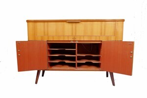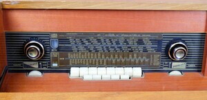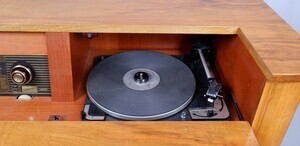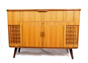 Die Siemens Musiktruhe TR 3 ist ein, optisch gut gelungenes, Möbelstück aus den 50er Jahren. Das in Hochglanz furnierte Holz erstrahlt heute noch wie damals. Die 20cm hohen, abschraubbaren Füße, sorgen für die notwendige Bodenfreiheit. Zur Bedienung der eingebauten Unterhaltungselektronik wird die hölzerne Faltabdeckung, mit Klappscharnier, nach vorn gezogen, so das Radio und Plattenspieler zugängig sind. Das verbaute Radiogerät stammt aus den Jahren 1957/1958 und ist mit 10 Röhren bestückt. Sechs eingebaute Lautsprecher sorgen für einen guten Klang. Mit zwei großen Drehreglern lassen sich die Senderstationen und die Lautstärke auswählen. Mehrere Drucktasten stehen für die Wahl der Wellenbereiche sowie für verschiedene Klangoptionen. Der ehemalige Besitzer hat den werksseitig eingebauten Dual Plattenspieler 1004 irgendwann (nach 1966) gegen den 10er Wechsler Dual 1010A ausgetauscht, der mit 16/33/45 und 78 Upm betrieben werden kann. Unterhalb der Faltabdeckung gibt es 2 Türen. Dahinter sind leere Fächer zur individuellen Nutzung eingebaut. Darin gefunden haben wir die Original Betriebsanleitung für den Plattenspieler Dual 1010. Rückseitig gibt es Anschlüsse für Plattenspieler, Tonband, Antenne/Erde und Zweitlautsprecher. 1957 kostete die Musiktruhe nahezu 1.000 DM.