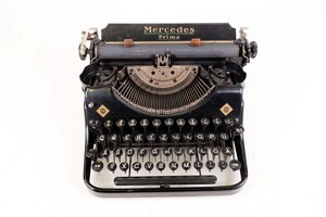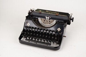 Die Mercedes-Bureau-Maschinen G.m.b.H wurde 1906 in Berlin gegründet. 1908 siedelte sich das Unternehmen in Mehlis/Thüringen an. Dort wurde die Produktion von Schreib- und Rechenmaschinen aufgenommen, die erst nach dem 2. Weltkrieg endete. Danach hieß das Unternehmen VEB Cellatron Büromaschinenwerk Zella-Mehlis. 1990 wurde der Betrieb aufgelöst; alle Gebäude am Standort des ehemaligen Mercedes-Werkes wurden abgerissen Nach 1930 waren auch Kleinschreibmaschinen im Programm. Dazu zählt auch unser Modell Mercedes Prima mit der Produktionsnummer 138.755 aus dem Jahr 1937/38. Der hochglänzende, schwarze Lack mit goldfarbener Beschriftung „Mercedes Prima“ und dem Firmenlogo, verleiht der Maschine eine gewisse Hochwertigkeit. Die Maschine hat noch keine automatische Bandumschaltung. Mit Hilfe eines kleinen Rädchens, auf der rechten Seite, wird das Farbband zurückgespult. Im Ziffernblock fehlt die Null, die in der Praxis durch ein großes O ersetzt wurde. Technisch handelte es sich um eine Typenhebelmaschine mit Vorderaufschlag und Wagnergetriebe. Ausgestattet ist das Modell mit einer 4 reihigen QWERT Tastatur, einer Zeilenschaltung und Rücktaste. Leider feht bei unserem Modell das Oberteil des Transportkoffers, so dass die Maschine nicht gegen Verschutzung gesichert ist..