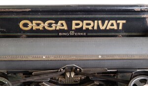 Die Gesellschaft wurde 1863 von den Brüdern Bing als Kurzwarenhandlung gegründet. Später kam eine Metallwarenfabrik für Hausgerätschaften und Blechspielzeug dazu. Ab 1922 baute Bing auch Schreibmaschinen, zunächst die "Orga Standard" ab 1923 die Orga Privat. Zu dieser Zeit (1923) waren die Bing-Werke AG schon ein Grosskonzern mit ca. 16.000 Mitarbeitern. (s. Quellenangabe) Unsere Orga Privat wurde 1923 hergestellt und trägt die Produktionsnummer 17 787. Damals kostete sie 210 Mark. Auf dem schwarz, glänzendem Lack prangt in großen, goldfarbenen Buchstaben der Name: ORGA PRIVAT – Bing Werke sowie das Firmen Logo. Die Volksschreibmaschine, wie sie auch genannt wurde, verfügt über eine reichhaltige Ausstattung. Dazu gehört. Wagenfreilauf, Randsteller rechts, Feststeller für Umschaltung, Rücktaste und staubdicht geschlossene Farbbandspulen, die bei unserem Modell leider fehlen. Alle Modelle zusammengefasst wurde die Orga Privat über fast 30 Jahre produziert. Mit dem Produktionsende 1953 endet auch die Geschichte der Orga Privat
