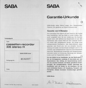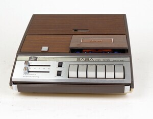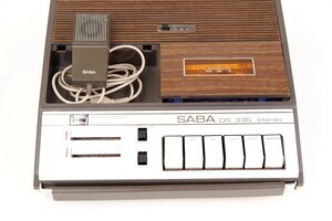 Der SABA Kassettenrecorder 335 Stereo ist ein tragbares Tonbandgerät aus den Jahren 1973 - 1975. Die Stromversorgung erfolgt wahlweise durch 6 Babyzellen oder über das Stromnetz. Die Bandgeschwindigkeit beträgt 4,74 cm/s. Die Funktionssteuerung erfolgt duch Drucktasten. Das Gerät hat einen eingebauten Lautsprecher, Batteriekontrolle, Aussteuerungsanzeige und Anschlüsse für Kopfhörer und Mikrofon. Das SABA Mikrofon wurde mitgeliefert. Lt. der vorgefundenen Originalrechnung wurde das Gerät am 6. Jan. 1975 beim Fachgroßhandel Eugen Schulz KG, Paulinstrasse 88 in Trier, gekauft. Der Preis: 223 DM + 11% MWStr. Interessant auch die berechneten Preise für Kompaktkassetten. So kostete eine C 90 - 3,46 DM und eine C 60 - 1,62 DM. Jeweils plus 11 % MWStr. Unser Gerät ist immer noch gut erhalten und lässt das abspielen von Kasseten problemlos zu.