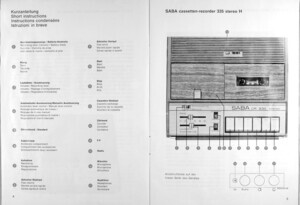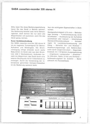Die Betriebanleitung für den Cassettenrecorder 335 von SABA, Villingen herausgegeben. Es ist ein Heft mit 20 Seiten im DIA A5 Hochformat. Gedruckt in 2 Farben und in den Sprachen Deutsch, Englisch und Französisch. Ein Schaltplan mit Instruktionen zu Service Einstellungen liegt bei.