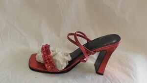 Ein Paar Pumps aus weißem Leder. Spitze Form, mit Leder bezogener Pfennigabsatz (ca. 5cm), je ein Riemen mit Schnalle dient der Befestigung. Die Schuhe verfügen über Zierlochungen. Hergestellt in Belgien. Datiert auf die 1960er Jahre.