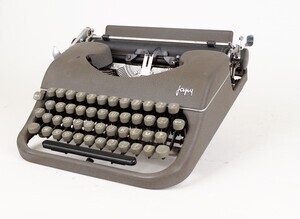 Frédéric Japy (1749 - 1812) war Uhrmachermeister in Beaucourt in der Franche-Comté. Seine Nachfolger stellten ab 1910 auch Schreibmaschinen her. Ab 1949 kam das Modell P 68, auch unter dem Namen „Japy Personelle“ auf den Markt. Es ist war Lizenzbau der Schweizer Schreibmaschine "Patria" Unsere Maschine, mit französischer Tastatur, trägt die Seriennummer 193 734 und wurde Mitte der 50er Jahre hergestellt. Die flach gebaute Schreibmaschine erscheint in einem grauen, matten Kräusellack und wurde in einem stabilen Metallkoffer (3 Kg) transportiert. Technisch handelt es sich um eine Typenhebelmaschine mit Vorderaufschlag und Wagenumschaltung. An Ausstattung sind u.a. vorhanden: Zeilenschaltung, schneller Wagendurchlauf, Randbegrenzer, 2 Farbenband, Wagenfeststeller und Rücktaste.
