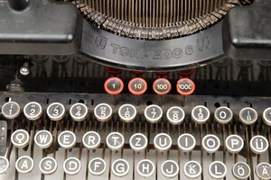 Die Torpedo-Werke AG (Weil-Werke) waren ein Hersteller von Fahrrädern und Büromaschinen in Frankfurt am Main. Das Unternehmen hatte schon vor dem zweiten Weltkrieg durch sein stark ausgebautes Fabrikationsprogramm einen wichtigen Marktanteil errungen. Das Modell Torpedo Standard war die erste deutsche Schreibmaschine mit Segmentumschaltung. (Absenkung des Typenkorbs für Großbuchstaben). 1943/1944 wurden die Werke durch Luftangriffe stark zerstört. Für die Entwicklung der deutschen Büromaschinen-Industrie seit 1945 kann der Wiederaufbau der TORPEDO-WERKE AG geradezu als repräsentativ gelten. Schon 1945 konnte wieder mit der Fertigung von Kleinschreibmaschinen begonnen werden. Es folgten die Buchungsmaschinen und ab 1952 Fahrräder und Motorräder bis 200 ccm. Unsere Torpedo 6 ist eine schwere, schwarz lackierte Büromaschine mit der Seriennummer 389 558, die 1941 produziert wurde. Sie unterschied sich grundsätzlich von ihren Vorgängern. Eine neuartige Segmentumschaltung machte es möglich, unterschiedlich breite Wagen auf der Grundmaschine zu verwenden. Eine Zeitgenössische Reklame rühmt besonders, den leichten und ruhigen Wagenlauf. Technisch gesehen handelt es sich um eine Typenhebelmaschine mit Wagnergetriebe und Vorderaufschlag. Ausgestattet ist die Torpedo 6 mit Segmentumschaltung, Tabulator, manuellen Bandumschaltung, 2 Farbenband, Rücktaste, Randlöser und einer Zeilenschaltung. Auf den Bildern sind die roten Dezimaltasten gut erkennbar. Ebenso die „Setz-Lösch“ Taste (Tabulator) und die „Rand-Ausl.“ (Randlöser) Taste . Leider sind, bei dem uns überlassenen Modell, einige Glasplättchen der Buchstabenabdeckung gesplittert. Ansonsten ist die Maschine, gespendet von einem Thalfanger Bürger, in einem guten Zustand.