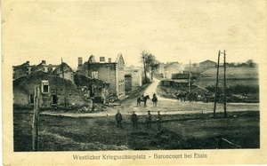 Karte im Querformat. Auf der Vorderseite: Schwarz/weiß Aufnahme eines zerstörten Dorfes, Bildunterschrift: "Westlicher Kriegsschauplatz - Baroncourt bei Etain". Auf der Rückseite: Absender: "Krankenträger Kantlehner / 15. A.K. 39. Inf. Div. 2. Sanitäts-(...)", Adressat: "Frau/ Selma Kantlehner/ Cöln a. Rhein/ Aachenerstr. 28 II.", Stempel 1: "K.D. Feldpostexped. / 12. 8. 16 / 39. Jm. Div.", Stempel 2: "Sold. Bri(...) / 3 P.B. 15.3.F" und ein handschriftlicher Text. Transkription: "Freitag Abend, d. 11.Aug.1916./ Liebe Frau u. Kinder!/ Da haben wir’s mal/ wieder, wie ich’s schon immer/ sagte, das einemal ist meine/ alte verliebt wie ein Kater,/ u. schreibt jeden Tag, dann hört/ man mal wieder die ganze/ Woche nichts u. hinterher soll/ dann schließlich der Brief noch/ gar verloren gegangen sein!/ Oder ist mein achtseitiger Brief/ von Freitag voriger Woche/ keine Antwort wert? Auf/ Anfang dieser Woche schrieb ich/ dir einen Brief. Nun Samstag/ Morgen noch keine Post. Doch nun/ herzl. Grüße Vater."