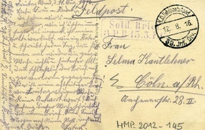 Karte im Querformat. Auf der Vorderseite: Schwarz/weiß Aufnahme eines zerstörten Dorfes, Bildunterschrift: "Westlicher Kriegsschauplatz - Baroncourt bei Etain". Auf der Rückseite: Absender: "Krankenträger Kantlehner / 15. A.K. 39. Inf. Div. 2. Sanitäts-(...)", Adressat: "Frau/ Selma Kantlehner/ Cöln a. Rhein/ Aachenerstr. 28 II.", Stempel 1: "K.D. Feldpostexped. / 12. 8. 16 / 39. Jm. Div.", Stempel 2: "Sold. Bri(...) / 3 P.B. 15.3.F" und ein handschriftlicher Text. Transkription: "Freitag Abend, d. 11.Aug.1916./ Liebe Frau u. Kinder!/ Da haben wir’s mal/ wieder, wie ich’s schon immer/ sagte, das einemal ist meine/ alte verliebt wie ein Kater,/ u. schreibt jeden Tag, dann hört/ man mal wieder die ganze/ Woche nichts u. hinterher soll/ dann schließlich der Brief noch/ gar verloren gegangen sein!/ Oder ist mein achtseitiger Brief/ von Freitag voriger Woche/ keine Antwort wert? Auf/ Anfang dieser Woche schrieb ich/ dir einen Brief. Nun Samstag/ Morgen noch keine Post. Doch nun/ herzl. Grüße Vater."