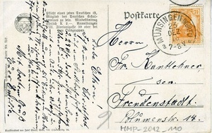 Karte im Hochformat. Auf der Vorderseite: "Deutschland und Österreich in Treue gesellt / Zerbrechen die Ränke der neidischen Welt" Darüber befinden sich zwei Frauen mit Kronen, Schild und Schwert ausgerüstet, die als Personifikation der beiden Länder dienen. Die Frau links ist die Personifikation für Österreich und die Frau rechts für das Deutsche Kaiserreich. Sie stehen auf Wolken und zu ihren Füßen sitzen drei Adler. Auf der Rückseite: Adressat: "Herrn / Fr. Kantlehner / sen. / Freudenstadt / Blumenstr. 14", Stempel: "Münsingen / 23 Dez / 7-8 V" sowie ein handschriftlicher Text: Transkription: "Liebe Eltern! / Ich komme am Christfest, / (...) am stadtbahnhof an / 2.28 Uhr, darf erst am Sonntag / Abends um 5 Uhr hier wegfahren / mit dem Auto über Urach, u. / (...) deshalb nur noch bis Eutingen. Habe / ein schönes Weihnachtsgeschenk bekommen, / Ihr werdet mir staunen. / Mit bestem Gruß / Euer Emilie."
