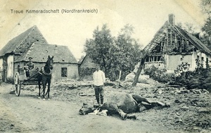 Karte im Querformat. Auf der Vorderseite: Im Hintergrund ist eine zerstörte Siedlung zu sehen. Im Vordergrund liegt ein totes Pferd, vor diesem ein Hund und dahinter steht ein Soldat. Links erkennt man eine Kutsche auf der ein Soldat sitzt. Die Bildüberschrift lautet: "Treue Kameradschaft (Nordfrankreich)". Auf der Rückseite: handschriftlicher Text. Transkription: "Freitag Abend, d. 31.Aug. 1917./ Meine Liebste Selma u. Kinder!/ Neues weiß ich zwar nichts zu berichten, möchte mir/ mal anfragen wie stehts denn mit der Uhr, kann ich die/ denn nicht bald bekommen? Eben hab ich mir noch wieder/ dein liebes Bildchen auf der Karte betrachtet, merk-/ würdig nur so ein kleines Bildchen, u. doch muß ich/ mirs so oft betrachten mit deinem so sehnsuchts-/ vollen Blick -? Hoffe euch noch alle gesund u./ munter u. sende euch herzlichste Grüße u. Küsse/ Euer Vater/ Ernst.".