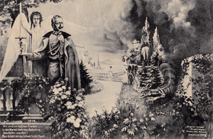 Karte im Querformat. Auf der Vorderseite: Aufdruck: "1914. Wir sind im tiefsten Frieden / in des Wortes wahrster Bedeutung / überfallen worden ! / Man drückt mir das Schwert in die Hand..." und "Originalentwurf Theophil Wagner. / Ausgef. Max Hammer / Nachahmung verboten". Das Motiv zeigt im linken Bildabschnitt Kaiser Wilhelm II., welcher von einem Engel ein Schwert überreicht bekommt. Die rechte Seite dominiert eine Rauchschwade, aus der ein skelettiertes Feuerwesen kriecht. Die Rückseite ist unbeschriftet und ungelaufen. Rückseitig Verlagsangabe: Theophil Wagner (Dietenbronn) Schwendi. [Bad Dietenbronn ist heute ein Ortsteil von 88477 Schwendi. Der Ort liegt in Württemberg, in der Nähe von Biberach an der Rieß.].