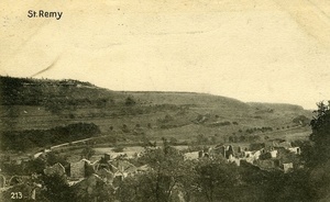Karte im Querformat. Auf der Vorderseite: Bildnis zerstörter Gebäude, im Hintergrund ist eine Landschaft abgebildet. Bildüberschrift lautet: "St. Remy". Auf der Rückseite: Adressat: "Frau Selma Kantlehner Cöln am Rhein Aachenerstraße 28. II", Poststempel vom 29. Mai 1916, handschriftlicher Text. Transkription: "Sonntag, d.28.05.1916/ L. Frau und Kinder!/ Neues weiß ich/ dir heute nichts zu schreiben,/ sende dir daher nur/ herzlichste Grüße, eben/ deine Karte vom 26. erhalten,/ mittlerweile wirst du auch/ meine 2 Briefe, vom Donners-/ tag u. gestern Samstag/ erhalten haben. Nun noch-/ mals sind mir alle herzl./ gegrüßt von Eurem/ Vater/ Ernst."