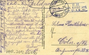 Karte im Querformat. Auf der Vorderseite: Bildnis zerstörter Gebäude, im Hintergrund ist eine Landschaft abgebildet. Bildüberschrift lautet: "St. Remy". Auf der Rückseite: Adressat: "Frau Selma Kantlehner Cöln am Rhein Aachenerstraße 28. II", Poststempel vom 29. Mai 1916, handschriftlicher Text. Transkription: "Sonntag, d.28.05.1916/ L. Frau und Kinder!/ Neues weiß ich/ dir heute nichts zu schreiben,/ sende dir daher nur/ herzlichste Grüße, eben/ deine Karte vom 26. erhalten,/ mittlerweile wirst du auch/ meine 2 Briefe, vom Donners-/ tag u. gestern Samstag/ erhalten haben. Nun noch-/ mals sind mir alle herzl./ gegrüßt von Eurem/ Vater/ Ernst."