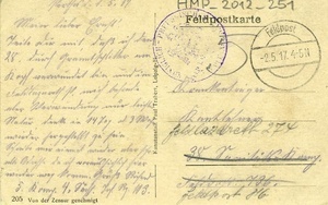 Karte im Querformat. Auf der Vorderseite: Schwarz-weiß Abbildung einer Villa. Auf der Rückseite: Adressat: "Krankenträger Kantlehner Feldlazarett 274 Feldpost 816", Poststempel: "Feldpost 2.5.17 4-5 N" sowie handschriftlicher Text. Transkription: "Mein lieber Ernst!/ Teile dir mit, daß ich den/ 28. durch Granatsplitter am/ Kopf verwundet bin und im/ Feldlazarett P. mich befinde/ aber Verwundung nur leichter/ Natur, denke in 14 Tag od. 3 Wochen/ wieder hergestellt zu sein./ Schreibe mir einmal wieder aber schr./ als Adresse da ich voraussichtlich hier/ wieder weg komme. Gruß Richard/ 5. Komp. 4.(...) Inf. Rg. 103".