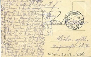 Karte im Querformat. Auf der Vorderseite: Foto eines Soldaten vor einem zerstörten Gebäude. Die Bildunterschrift lautet: "Zusammengeschossener Ort an der Lorettohöhe." Hanschriftliche Beschriftung: "Eben d. Brief erhalten.". Auf der Rückseite: Adressat: "Frau Selma Kantlehner Cöln am Rhein Aachenerstraße 28 II", Poststempel vom 21. Juni 1916 sowie handschriftlicher Text. Transkription: "Dienstag Nachmittag, d. 20.06.1916/ M. L. Frau u. Kinder/ (...)/Sonnatg habe ich erfahren, daß/ du Freitag Abend Besuch bekommen/ hast, bin folgendessen erst/ recht neugierig auf deinen/ Brief von Sonntag, das Paket-/ chen enthalten, schmeckt alles/ sehr gut, sowohl die Wursch (sic.)/ als auch die Butter sind aus-/ gezeichnet nochmals herzl. Dank./ Hoffe u. wünsche dir, daß die/ zwei Kleinen wieder gesund/ sind damit du deine wohl-/ verdiente Nachtruhe wieder/ bekommst. Recht herzl. Grüße/ u. Küsse sendet dir dein Ernst."