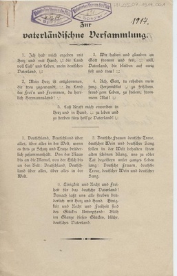 Blatt mit Liedtexten "Zur vaterländischne [sic] Versammlung". Handschriftliche Bemerkung auf der Rückseite: "Diese Lieder wurden auf den von Herrn Gebhard / Speyer im Bezirk Speyer Land veranstalteten Propaganda-Abenden für die 6. Kriegsanleihe gesungen u. für diesen Zweck gedruckt."