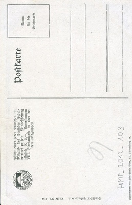 Karte im Hochformat. Auf der Vorderseite: Abbild von Kaiser Franz Joseph I. von Österreich. Er ist von einem goldenen Rahmen umgeben, der oberhalb aus dem Habsburger Doppeladler und einer Krone besteht. Seitlich befinden sich die Fahnen des Kaisertums Österreich und die des deutschen Kaiserreichs. Darunter ist eine Burg in einer winterlichen Landschaft abgebildet. Die Rückseite ist unbeschriftet und ungelaufen.