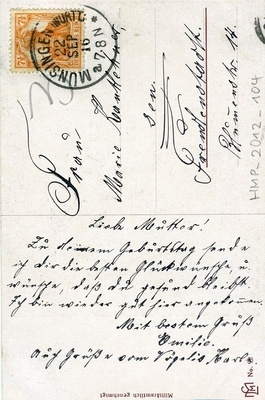 Karte im Hochformat. Auf der Vorderseite: Portrait von Kaiser WIlhelm II. mit der Bildunterschrift: "Geschlagen wird der Feind / unter allen Umständen.". Auf der Rückseite: Adressat: "Frau / Marie Kantlehner / sen. / Freudenstadt / Blumenstr. 14", Postempel vom 22. September 1916, und der Text: "Liebe Mutter! / Zu deinem Geburtstag sende / ich die die besten Glückwünsche u. / wünsche, dass du gesund bleibst. / Ich bin wieder gut hier angekommen. / Mit bestem Gruß / Familie. / Auch Grüße vom Vögelis Karl."