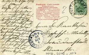 Karte im Querformat; Vorderseite: Gruppenfoto von Kaiser Wilhelm II. mit seiner Familie und einem Hund, vor einer gartenähnlichnen Kulisse; Rückseite: Adressat: "Herrn Fr. Kantlehner / Küpfnersch. u. Metallg. / Freudenstadt / Blumenstr.", Poststempel vom 9. April 1906, Text: Stuttgart, d. 8.Apr.1906. Grußworte mit schwarzer Tinte in Sütterlinschrift geschrieben: "L. Eltern. Möchte euch bitten,/ mir mitzuteilen/ um wieviel Uhr Kirch-/ gang ist u. wo die/ Hochzeit ist. Ich komme/ wahrscheinlich erst/ am Sonntag abend/ 8.40 nach Freudenstadt./ Sie haben alle schon/ (...) Bauchweh in alle/ (...) weil/ ich fort will. Es/ grüßt Euch herzlich/ sowie (...)/ Eure Tocher Marie."