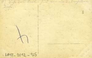 Karte im Querformat. Auf der Vorderseite: Zerstörte Wohngegend mit zwei Personen, vermutlich Soldaten. Auf der Rückseite: Am oberen Rand eine handschriftliche Notiz in Sütterlin: "Diese drei Karten sind von ein u. demselben/ Dorfe." Diese wurde mit einem Bleistift geschrieben.