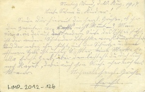 Karte im Querformat. Auf der Vorderseite: Sieben Männer, die sich um einen Tisch versammelt haben. Einige von ihnen halten Bierkrüge in der Hand. Auf dem Tisch steht eine Holzstück mit der Aufschrift: "Handwerker S. K. 38". Der zweite man von rechts ist außerdem mit einem Kreuz gekennzeichnet. Auf der Rückseite der Text: "Montag Abend d.20.aug.1917/ Liebe Selma u. Kinder!/ Sende dir hiermit die herzl. Grüßem ob ihr/ den zweiten von rechts wohl kennt_? Mein/ vis-a-vis das auch der anderen Seite des Tisches sitzt,/ ist der andere Schneider Blaschke vom "Krümmer Büchel"/ Und der neben ihm sitzt, mit der Schürtze u. dem/ offenen Hals ist unser Sattler, eine Marke so/ alla Ernst Zeeb, über den lachtest du dich auch/ noch kaput, dabei auch son Riese eher noch was/ kleener. Nochmals herzl. Grüße/ Ernst."