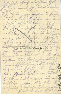 Karte im Querformat. Auf der Vorderseite: Ansicht auf Olicy. Auf der Rückseite der Text: "Charfreitag Abend, 1917/ Meine Liebste Selma u. Kinder!/ Hatte zwar gestern u. heute/ auf ein Lebenszeichen von die gehofft, doch leider vergeblich-,/ kann gut merken, daß du am/ arbeiten bist u. dazu ist noch Char-/ woche, wo du zu putzen hast. Heute/ war hier zum ersten mal schönes/ Frühlings-Wtter. Hast du die Packet-/chen mit der Suppen-Kratware u./ das mit dem Zucker u. den Ringlein/ erhaletn. Heute Nachtmittag hatte ich/ eine Beschäftigung, dabei dachte ich/ auch an den Ernst, hätte nämlich/ beim Pferde-Apell einen "Schimmel"/ zu halten u. da waren auch welche/ die Sätze machten. nun sende euch/ nochmals Herzliche Ostergrüße/ Euer Vater Ernst."
