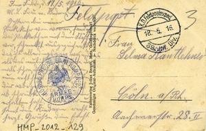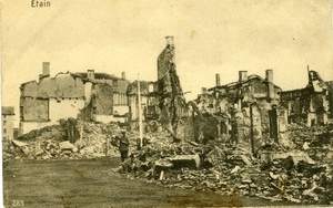 Karte im Querformat. Auf der Vorderseite: Zerstörte Gebäude in Etain. Auf der Rückseite: Adressat: "Frau Selma Kantlehner Köln am Rhein Aachenerstraße 28 II", Poststempel vom 18. Mai 1916. Der Text lautet: "Im felde, d.17.5.1916/ M.L. Frau m. Kindern!/ Gestern bei meiner/ Rückkehr von vorne, fans ich/ das Packetchen mit dem Fläschchen/ vor, schmeckt ausgezeichnet!/ das ist allerdings gang was anderes/ als das neulich u. ich schreibte da-/ mals schon, das (...) (...) (...), nunr recht herzl.Dank(?) sandte/ die vorgestern ein Brief/ ab, schreibte ob du denselben(?)/ erhalten hast. Sende dir nun/ samt den Kindern recht/ herzl. Grüße dein Ernst."