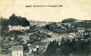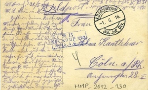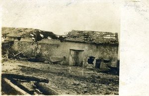 Karte im Querformat. Auf der Vorderseite: Zerstörtes Haus, am Rande ist eine kleine Notiz zu sehen mit der Aufschrift: "Bourbon-Ferme". Auf der Rückseite: Adressat: "Frau Selma Kantlehner Köln am Rhein Aachenerstraße 28 II", Poststempel vom 1. Juni 1916. Der Text lautet: "Mittwoch,d. 31.5.1916/ M.L. Frau m. Kindern!/ Gestern deine Karte von/ Monat erhalten, herzl. Dank/ Kannst mir Maria’s Bruder/ seine Adresse nochmals schicken/ da ich dieselbe aus Versehen/ rerissen habe. Sieh’ dir diese/ Karte mal gut an u. ver-/wahre sie gut, eine weitere/ hiervon wird folgen. Werde/ dir wohl Morgen Donnerstag/ wieder ein Brief schreiben./ Für heute sei mit mit den/ Kindern recht herzl. gegrüßt/ u. geküßt von dingem "Ohl"!"