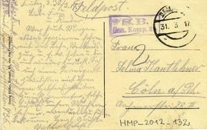 Karte im Querformat. Auf der Vorderseite: Fotographie von Vouziers bzw. von der Bournizel Straße. Auf der Rückseite: Adressat: "Frau Selma Kantlehner Köln am Rhein Aachenerstraße 28 II", Poststempel vom 31. März 1917. Der Text lautet: "Freitag, d. 30.3.17./ Liebe Frau/ u. Kinder!/ War heute Morgen/ etwas spazieren fahren/ mit der Bahn, Verbands-/ zeug u.s.w. holen u, bin/ nun wider zurück. Sah/ auch einen Transport/ Zivilisten mit ihren/ paar Habseelichkeiten/ zurückwander(-...) Solche/ Bilder müßten unsere (...) / sehen u. eventuell zu fühlen/ bekommen. Herzl. Grüße/ Vater Ernst."