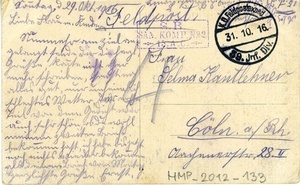 Karte im Querformat; Vorderseite: Ansicht auf Briey (Frankreich) im Kriegsjahr 1915; Rückseite: Adressat: "Frau Selma Kantlehner Köln am Rhein Aachenerstraße 28 II", Poststempel vom 31. Oktober 1916, Text: "Sonntag, d.29.Okt.1916/ Liebe Frau u. Kindern! / Nunmehr am Ziel an-/gelangt sende dir die herzl. Grüße, konnte nicht eher/ mehr schreiben, sonst noch/ alles gut, nur unheimlich/ schlechtes Wetter. Der erste/ Teil von dem Gedicht war/ auch sehr schön, ob du wohl/ meinen zweiten Brief/ bekommen hast, ich habe bis jetzt/ noch nichts wieder bekommen/ als deinen Brief vom Montag/ Herzlichste Grüße Ersnt."