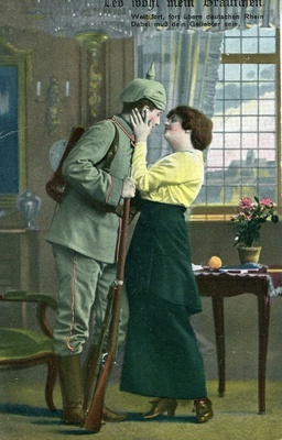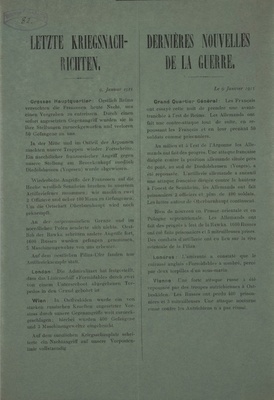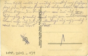 Karte im Querformat; Vorderseite: Ansicht auf die zerstörten Straßen und Häusern in Rouvers; Rückseite: Text: "Dein Schill wollte ich neulich eigentlich noch hinzuge-/ fügt haben, daß wir hier in der vielgenannten Woevre-/ Ebene liegen, die Franzosen vor uns auf dem/ Höhenzug, ziemlich weit rechts von uns Fort Douaumont, etwas mehr auf uns zu, allerdings auch noch ziemlich/ weit von uns Fort Vaux."