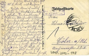 Karte im Querformat; Vorderseite: Foto der Kürassierkaserne in Vouziers mit entsprechender Beschriftung; Rückseite: Adressat: "Frau/ Selma Kantlehner/ Cöln a. Rhein/ Aachenerstr. 28 II", Poststempel vom 22. Januar 1917, Text: "Sonntag Abend, d.21.1.1917/ M.L. Frau mit Kindern!/ heute kam ich endlich/ dazu, daß Packetchen abzu-/ schicken, die Briefmappe/ ist ein Weihnachtsgeschenk/ vom Gefallenverein. Hier/ ists jetzt trocken kalt, aber/ besser als der Matsch, Wie / sieht’s mit dem Ernst seinen/ Ohrenschmerzen, davon weiß/ ich Bescheid, die hatte ich als/ Junge auch einmal. Habe/ heute vormittag 11-12Uhr/ Besonders herzl. Euer ge-/dacht bei der Hl. Mess u./ Kommunion, Nun sende Euch/ Herzl. Grüße Euer Vater Ernst."