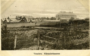 Karte im Querformat; Vorderseite: Foto der Kürassierkaserne in Vouziers mit entsprechender Beschriftung; Rückseite: Adressat: "Frau/ Selma Kantlehner/ Cöln a. Rhein/ Aachenerstr. 28 II", Poststempel vom 22. Januar 1917, Text: "Sonntag Abend, d.21.1.1917/ M.L. Frau mit Kindern!/ heute kam ich endlich/ dazu, daß Packetchen abzu-/ schicken, die Briefmappe/ ist ein Weihnachtsgeschenk/ vom Gefallenverein. Hier/ ists jetzt trocken kalt, aber/ besser als der Matsch, Wie / sieht’s mit dem Ernst seinen/ Ohrenschmerzen, davon weiß/ ich Bescheid, die hatte ich als/ Junge auch einmal. Habe/ heute vormittag 11-12Uhr/ Besonders herzl. Euer ge-/dacht bei der Hl. Mess u./ Kommunion, Nun sende Euch/ Herzl. Grüße Euer Vater Ernst."