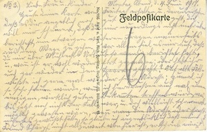 Karte im Querformat; Vorderseite: Grußtext endet erst auf der Vorderseite. Das Foto zeigt deutsche Soldatengräber auf dem Franzosenfriedhof in Vouziers mit entsprechender Bildunterschrift. "...Tage u. läßt auch dich grüßen. Nun sei auch von mir herzl. gegrüßt von deinem d. l. Ernst./ Wie kommst du jetzt mit den Lebensmitteln/ aus, (...) frisches Gemüse giebt?/ Hast du noch Kaffee?/ Nochmals herzl. Gruß./ Lege dir etwas von Beethoven bei, weil es mir gefällt."; Rückseite: Text: "Liebe Frau u. Kinder! Montag Abend, d. 4.Juni.1917/ Heute deine Karte von Freitag erhalten, u. daraus ersehen/ daß es dir angeblich noch gut geht, doch/ will mir scheinen, daß du mir neuerdings nicht mehr über/ berichtest, um etwaigen weiteren Fragen meinerseits/ aus dem Wege zu gehen, vor allem fiel es mir auf, daß/ du mir über Mühlecks Urlaub so wenig berichtet hast,/ u. wann ist er wohl wieder fort gegangen; oder habt ihr/ euch gar wieder in den Haaren gehabt? Auf alle Fälle/ wüßte ich gerne mal wieder seine Adresse; zumal ich/ so sehr freuen würde, wenn ich hier draußen auch mal einen/ einzigen, wirklich guten Bekannten treffen würde, was/ bis jetzt noch nicht der Fall war, u. doch vielleicht schonmal/ möglich gewesen wäre, wenn man die Adresse oder sonst/ näheres gewußt hätte, so glaube ich augenblicklich daß mein/ Freund Schörpf(?) nicht allzuweit von hier ist, er schrieb mir diesen..." (s.oben)