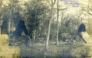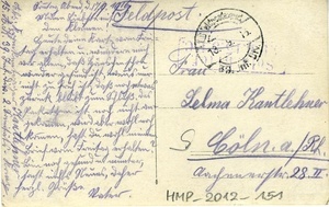 Karte im Querformat; Vorderseite: Foto eines Soldatenlagers im Wald mit handschriftlicher Beschriftung "Waldlager - Hermeviller-Wald"; Rückseite: Adressat: "Frau / Selma Kantlehner / Cöln a.Rh. / Aachenerstr. 28 II.", Poststempel vom 18. September 1916, Text: "Sonntag Abend, d. 17.9.1916/ Meine Liebste mit den Kleinen!/ Heute deine Karte vom Frei-/tag erhalten u. wundere mich/ vor allem, das Hänschen schon/ wieder gesund ist, wenns nur/ nicht zu früh ist, daß noch etwas/ zurück bleibt zum Schluß, daß/ Packetchen ist noch nicht an-/ geommen, wird aber wohl noch/ kommen, hast du wohl meinen/ Brief vom Freitag erhalten?/ Bin noch gesund u. munter,/ sonst nichts Neues, daher/ herzl. Grüße Vater."