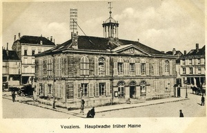Karte im Querformat; Vorderseite: Abbild der Hauptwache (früher Mairie) ín Vouziers mit entsprechender Bildunterschrift; Rückseite: Text: "Mittwoch, d. 3.Jan.1917. Nun habe ich meine Wache/ hinter mir. Wie steht’s denn mit dir gesundheitlich? Und/ steht auch noch immer der Topf von den Kleinen/ schön hübsch mitten in der Stube-? Und deine eigenen/ Brocken u. Pluten? Hat Joseph immer noch nicht geschrieben?/ Und wie (...), wie oft warschte schun (..) (..)?/ Nu wollt ich heute noch allerhand schriewe, nu weiß/ ich (...) nischt wie, drum Gruß, Kuß u. Schluß,/ u. en glücksilliges Neus Jahr/ Viele Grüße an all dort/ bekannte Gesocks, mein/ Emma, Marie, Frau Briegs/ Sophie, Gerüdige, Schöll u. P. Wiggerschter./ von (...) Nhl./ Ernst."