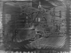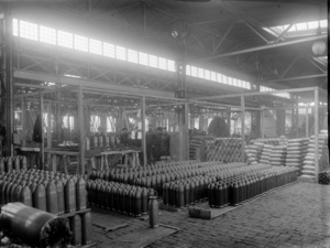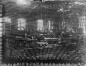 Schwarz/weiß Aufnahme Originaltitel: "Ges(ellschaft) f(ür) Förderungsanlagen Heckel Rohrbach" Ab 1915 stellen die meisten pfälzischen Industriebetriebe für die Dauer des Krieges fast vollständig auf die Produktion von Rüstungsgütern um. Frauenarbeit in der Industrie nimmt während des Ersten Weltkrieges deutlich zu. Hier: Werkshalle mit Frau an einer durch Transmissionsriemen angetriebenen Drehbank. Granatenherstellung bei der Fa. Heckel, Gesellschaft für Förderungsanlagen in Rohrbach bei St. Ingbert, 17. April 1917. Heute (2014) gehört die Firma zur Thyssen-Krupp AG. Rohrbach gehörte damals zur (bayerischen) Pfalz, heute ist Rohrbach ein Stadteil von St. Ingbert im Saarland.