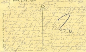 Karte im Querformat; Vorderseite: Foto des Stadtpanoramas von Douai mit der St. Pierre Kirche mit entsprechender Bildüberschrift in französischer Sprache; Rückseite: Text: "Dienstag Abend, d.17.Juli.1917/ Liebste Selma u. kinder!/ Heute Mittag also doch schon deinen versprochenen Brief/ vom Sonntag erhalten, hast also diesmal Wort gehalten. Herzl./ Dank. Da ich Morgen früh von 3-5 Uhr Wache habe, werde/ ich dabei besonders deiner gedenken, zu deinem (...)/ Unternehmen. Bin bis jetzt noch nicht vorne gewesen,/ u. weis noch nicht ob ich in nächster Zeit mit vor muss./ Ist aber augenblicklich ziemlich ruhig hier, es gehen daher/ verhältnismäßig wenig von uns mit vor, denn wir sind/ mit 3 San.Komp. hier. Nun noch eins beunruhige dich doch/ nicht allzu sehr, wir können ja doch dem uns von Gott bestimm-/ ter Schicksal nicht entgehen, es hat darum gar keinen/ Zweck, das wir uns so sehr ängstigen. Und daß wir jetzt/ so lange auseinander sein, u. uns gegenseitig entbehren/ müssen, daß wollen wir als Büße aufnehmen, für unsern"