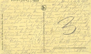 Karte im Querformat; Vorderseite: Foto des "Hôtel de Ville" [Rathaus] von Douai; Rückseite: Text: "Donnerstag Abend, d.19.7.1917/ Liebe Selma u. Kinder!/ Gestern schon deine L. Karte vom Montag erhalten. besten Dank./ Ist dir dein Unternehmen wohl geglückt gestern? Zu/ deiner Beruhigung kann ich dir heute mitteilen, daß ich vor-/ läufig nicht mit nach vorne berufe, wenn’s so bleibt wie es jetzt/ ist. Nun sag mal, waß hälste davon, ich habe schon gedacht, dem/ Feldwebel mal den Verschlag zu machen, ob ich nicht die Näh-/ maschine von dort hierher holen kann, wir haben nämlich/ in der Komp. keine. Und wenn ich unsere Maschine haben könnte,/ bekäme ich vielleicht für 5 Tage Urlaub (dienstlich). Ich denke/ ich könnte dir für wenig Geld dort eine andere kaufen, u. die/ Maschine würde ja doch mein Eigentum bleiben. Nähst du/ die Säckchen darauf? Ich fürchte sie näht nicht mit Garn./ Was meinst du dazu? denn sonst ist an Urlaub noch lange nicht/ zu denken. Schreib mir mal was mit, was mir Ernst oder / Hännchen vielleich gerne fragen, schreibe oder erzählen/ möchten, sie sollen sich mal überlegen, was sie dir denn diktieren./ Viel herzl. Grüße d. Ernst"