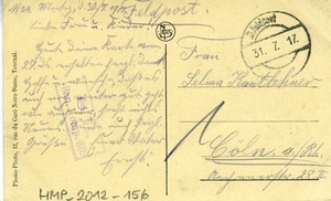 Karte im Querformat; Vorderseite: Abbildung der "Porte de Valenciennes" in Douai; Rückseite: Adressat: "Frau / Selma Kantlehner / Cöln a. Rh./ Aachenerstr. 28 II.", Poststempel vom 31. Juli 1917, Text: "Liebe Frau u. Kinder! / Heute deine Karte vom / 27. (...) erhalten herzl. Dank! / Hoffe u,. wünsche, dass es / euch noch weiter gut geht / wie auch mir, sonst nichts / Neues. Sende euch herzl. / Grüße. Euer Vater / Ernst."