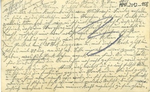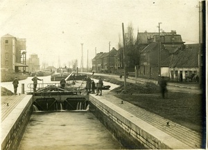 Karte im Querformat; Vorderseite: Abbildung einer Schleuse innerhalb eines Ortes; Rückseite: Text: "Sonntag Abend, d.3.Jan.1918./ Meine Liebste Semla u. Kinder!/ Deine beiden Kartenbriefe vom Mittwoch u. Freitag erhalten,/ u. heute auch das Packetchen mit den Sternchen, recht herzl. Dank für/ alles. Nun hab ich wie es scheint, was(...) daß ich dir/ schreib, daß die Verpflegung hier schlecht ist, nun meinst du/ wohl, müßtest mir wer weiß was (...) hierher schicken./ das Geld hab ich noch nicht, wird aber schon kommen. Gestern ging/ ein Packet mit 50 Stck. Cigarren u. mit dieser Karte geht ein/ solches mit 40 Cig. an dich ab. Bitte mir aber immer genau anzu-/ geben, was für Packetchen angekommen sind. An dem Sweter/ für Lisbeth sind die Ärmelchen noch nicht gesäumt, weil ich nicht/ wüßte ob die Länge stimmt, daß wirst du ja auch selbst können,/ du schriebst die Empörung gegen die Sticknadel sei dort groß,/ u. hier sind wer weiß wie viele, die sich freuen, weil gestrickt/ wird, u. ich stehe da fast alleine mit meiner Ansicht, bin so nervös/ daß ich manchmal am Ende meiner Kraft angelangt zu sein glaube. Sei mit den/ Kindern aufs/ herzl. gegrüßt u./ geküßt von/ Euerm/ Vater Ernst."
