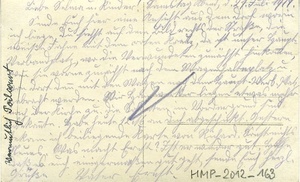 Karte im Querformat; Vorderseite: Foto eines Soldaten vor einem Strommast innerhalb eines Ortes; Rückseite: Text: "Vermutlich Toilcourt". (Thiaucourt?) "Liebe Selma und Kinder! Sonntag Abend, d. 21.Juli. 1917./ Sende Euch hier eine Ansicht aus dem Dorf worin/ ich liege, Du siehst auf dem Bild rechts der Starße, die/ weiße Fahne mit dem roten Kreuz, da ist unser Haupt-/ Verbandsplatz, wo die Verwundeten zunächst hinkommen, wenn sie (...) zunächst nach dem Wagenhalteplatz u. von dort denn mit den Wagen nach dem Haupt- Verb.Platz/ gebracht werden. Wir (...) liegen etwas mehr/ nach der Kirch zu. Die Soldaten im Hintergrund sind/ Unbekannte. Habe heute 12 M an dich abgeschickt. Gestern/ bekam ich beiliegende Karte von Richard. Sonst nichts/ Neues. Was macht Ernst? Ist er wieder gut.Hoffe/ dass es auch einigermaßen gut geht, sende Euch herzl./ Grüße Vater Ernst."