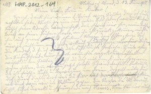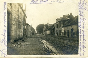 Karte im Querformat; Vorderseite: Straßenansicht auf die Pont Girart(?) vor Reims, Text geht auf der Vorderseite weiter: " (...) mit den Kindern Gott befohlen/ u. herzl. gegrüßt von Euch liebendem Vater/ Ernst./ Werde Monika (ß) u. Kirchenblatt in diesen/ Tagen lesen."; Rückseite: Text: "Mittwoch Abend, d. 13.Juni 1917./ Meine liebe Frau u. Kinder!/ Herzl. Dank für deinen l. Brief vom Sonntag den ich heute/ erhalten habe.Wirst ja nun auch mein Bild haben, wenn du Richard/ Lätsch seine Adresse wieder hast, dann schrieb mir sie, mein letzter/ Brief an seine frühere Komp. an ihn ist zurückgekommen, möchte/ ihm noch gerne ein Bild schicken. Wegen dem Essen, sorge dich/ nur ja nicht um mich, habe vollauf genug gegessen, sorge nur für dich u./ die Kinder, d.h.ich weiß daß tust du ja sowieso. Heute ging/ die Seife ab, schreibe mir sofort wenn sie angekommen ist. Aber/ (...) du am Sonntag hättest du doch mit den Kindern spazieren/ gehen sollen, denn (...) jetzt so oft Schwindelanfälle bekommst,/ da ist frische u. Bewegung im freien, doppelt nötig für/ dich. Durch dieses Dorf das du hier auf der Karte siehst, kommen/ wir durch wenn wir in Stellung gehen. Die Straße die du darauf/ siehst, führt direkt u. schnurgerade nach Reims. Nun sei mir auch"