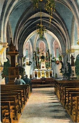 Karte im Hochformat; Vorderseite: Farbliche Abbildung des Kircheninnenraumes in Brecy. Der gesamte Apsisbereich ist mit Blumen und Kränzen dekoriert und im linken Abschnitt des Bildes sind zwei Soldaten zu sehen, die vermutlich beten.; Rückseite: Text: "d. 20.3.1917/ Liebe Frau mit d. Kindern!/ Herzl. Dank für das Packetchen mit den Äpfeln/ u. für deinen Brief von Sonntag d.18. du schreibs Maria/ gings wieder besser, war die denn krank u, was hat ihr/ gefehlt? Herzl. Grüße an sie u. Joseph. Morgen Mittwoch/ gehe ich nun wieder nach vorne für 10 Tage. hoffentlich/ bist du während dieser Zeit nicht wiederso schreibfaul/ wie neulich, lasse mir während der Zeit möglichst auch etwas Zeitungen(frische) zukommen. Bezüglich des Packete schickens, dachte ich, daß du fetten Speck gebrauchen könntest/ weil ich annehme daß du wenig Fett bekommst. Schicke/ vielleicht Morgen noch ein Packet mit Waschpulver u. etwas/ Seife ab, diese ist noch sehr frisch u. schäumt stark. Nun seid mir alle herzl. gegrüßt von Eurem euch alle herzl. liebenden/ Vater Ernst."