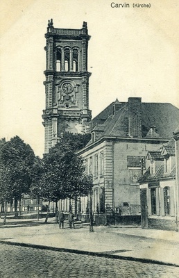 Karte im Hochformat; Vorderseite: Foto der Kirche in Carvin; Rückseite: Text: "Montag Mittag, d.24.Sept. 1917/ Minge Lena Plünn!/ Gestern vor lauter, laß mich auch mit, nicht zum/ Schreien gekommen, aber das schad nix, häß mir ja/ och en paar Tag nit min jeschriewe_. Sonst noch/ alles gut. hoffentlich auch bei dir u. den Kindern./ drum Grüß, Küß u. Schluß - - - / Dinge Julius/ In umstehender Kirche hatten wir gestern/ Gottesdienst. Auf - baldiges - frohes - Wiedersehen?"