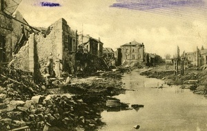 Karte im Querformat; Vorderseite: Zerstörte Ortschaft. Am oberen Rand ist ein Schriftzug zu sehen ("Fresnes"), der mit einem Holzstift durchgestrichen wurde. Des Weiteren sind am oberen rechten Rande mit dem Holzstift Linien gezeichnet worden; Rückseite: Adressat: "Frau / Selma Kantlehner Cöln am Rhein Aachenerstraße 28 II", Poststempel vom 24. Mai 1916, Text: "Dienstag, d.23.5.1916./ Meine Liebsten u. Kindern!/ Gestern Montag noch keine/ Post von dir bekommen, auch/ heute ist schon ein Teil hier,/ aber noch nichts hier. Sende/ die u. den Kindern herzl. Grüße, sonst noch alles/ beim Alten, u noch schönes Wetter. Was macht wohl/ Filler Peter? u. Mühlmk.?/ Nochmals Herzl. Grüße/ dein Ernst."